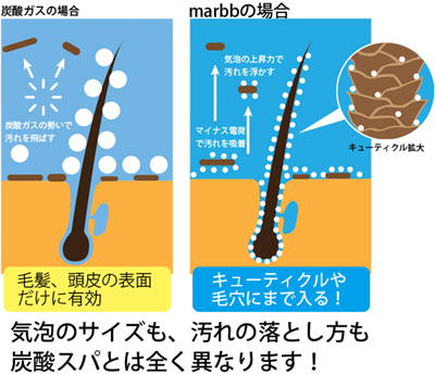 マイナスの電荷を帯びた炭酸の2000分の1以下の大きさのmarbbマイクロバブルは、毛根の細部にまで入り込んで汚れを吸着、除去します。これを利用することで、肌や髪の細胞間の洗浄・保湿・保温・石鹸の泡立ち・繊維間の汚れ除去・土や植物根への酸素供給を助けます。